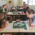 Deux rondes avant la fin, Arnaud était sûr d’être en finale. À la dernière ronde, Manu Lazard devait battre Marc Tastet 70 à -6 pour passer devant lui au départage :-). Et Marc n’avait besoin que de 12 pions pour être devant Takuji au départage si ce dernier gagnait. En fait Takuji a perdu assez vite contre Arnaud. Du coup Marc était assuré d’être en finale même en perdant contre Manu, ce qu’il a fait finalement.