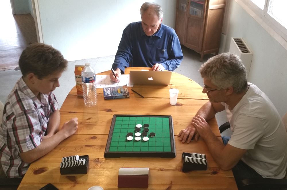 Après un repas dans une autre pizzeria, peut-être un peu plus proche que celle de la veille, la finale pouvait commencer. La première partie était serrée. Manu, avec les noirs, était un peu forcé de contrôler la diagonale au coup 43. Arthur, avec les blancs perdait la parité en fermant un trou de 7 cases au coup 44, ce que Manu sanctionnait immédiatement par son coup 45 (n’essayant pas de recontrôler la diagonale, mais jouant la parité). Dès lors, la fin de partie était facile pour Noir, qui se permettait même le luxe de laisser Blanc jouer le dernier coup. Le bon coup 44 était h2. D’accord, ça joue la parité, mais ça fait quand même peur car on a l’impression de tout donner.