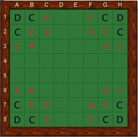 Il est utile d’avoir à l’esprit une évaluation de la valeur des cases, même si la stricte correspondance entre les cases C et X entre les deux jeux est discutable. Selon Rusty Horner, de la fédération américaine d’Othello , une position des cases C et X pourrait être la suivante (ce graphique permet de guider des choix stratégiques, il nous montre aussi l’importance des cases « coins » A2 et B1).