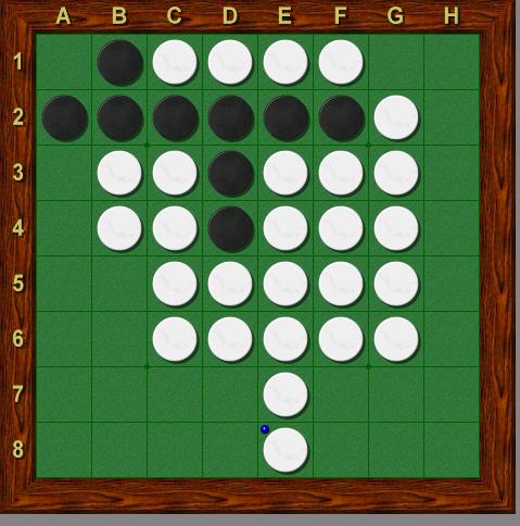 Nous présentons ici une première approche stratégique… mais au Reverse, comme à Othello, aucune règle ne fonctionne jamais parfaitement… C’est pourquoi nous vous proposons un petit solitaire, dans lequel blanc a un contrôle parfait sur A1 et A8, deux coins « idéals », mais où il a également sacrifié le coin H1 – sacrifice dont le but était un gain de temps.