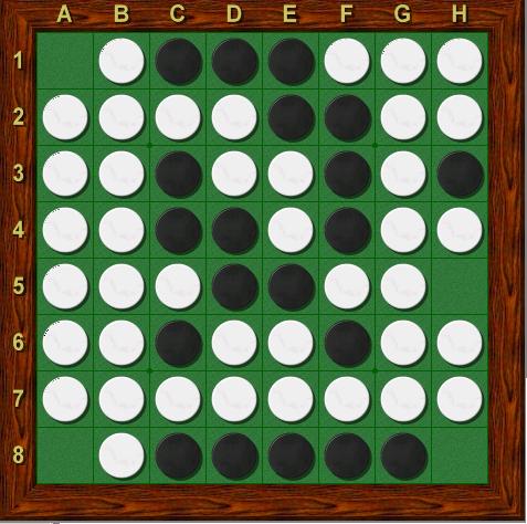 Au Reverse Reversi, on joue très souvent les coins en dernier, et le coup intuitif serait de jouer en H5 ; l’idée est pour noir de combler le dernier trou qui ne soit pas un coin, puis de laisser jouer la parité dans les coins pour gagner. Malheureusement pour lui, blanc possède deux coins idéals en A1 et A8, et c’est noir qui va devoir jouer les deux derniers coups. La suite H5 H8 A1 A8 est perdante pour noir avec 33 pions.