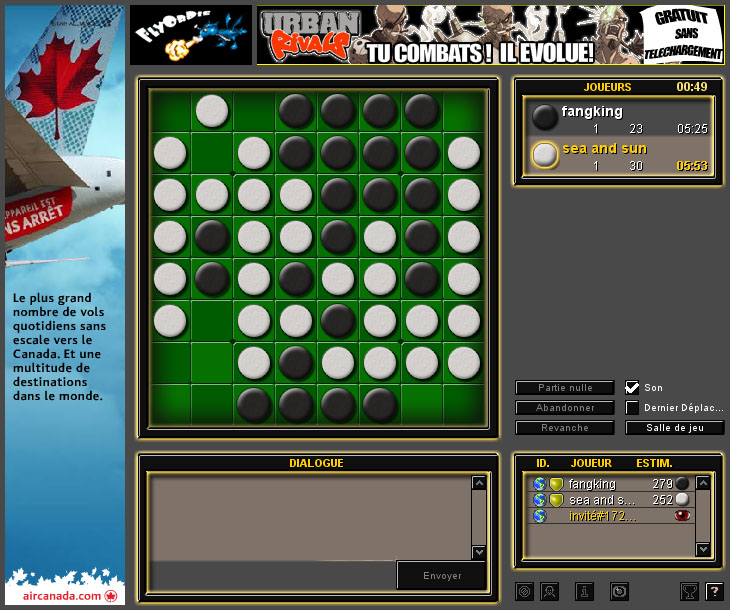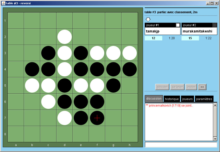 Un nombre d’othellistes assez important sur ce site qui n’est pourtant pas exempt de reproches: omniprésence de la publicité, impossibilité de créer une table de jeu et d’attendre un adversaire, le serveur repose uniquement sur un système d’invitations, ce qui rend parfois fastidieux la recherche d’un partenaire de jeu…