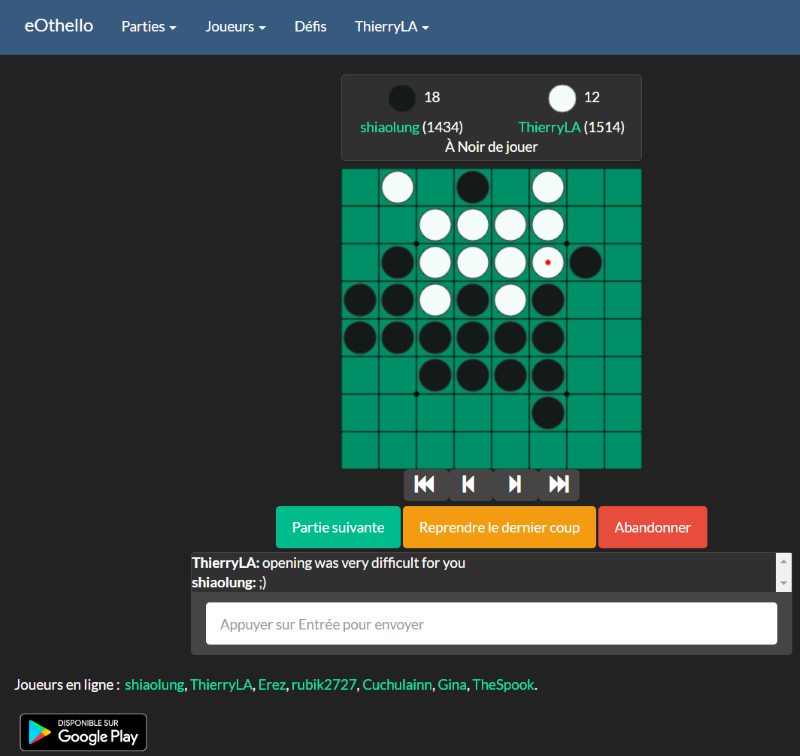 eOthello est un site dédié à notre jeu . Sa particularité est de proposer des parties pratiquement sans limite de temps (jusqu’à 72 h par coup). Il est donc possible de jouer à son rythme plusieurs parties à la fois (jusqu’à 20). Cette formule au coup par coup loin des standards actuels, ressemble parfois au jeu par correspondance et nous réconcilie avec une certaine idée du jeu, disons « stressless »… Une aubaine pour les joueurs qui ont une connexion capricieuse ou qui n’ont que peu de temps à consacrer au jeu sur Internet. En 2017, le design d’eOthello été refait, afin de s’adapter parfaitement à la taille de chaque écran, et notamment aux mobiles. De plus, une application Android est désormais disponible. Le site compte un millier de joueurs inscrits et en permanence, une trentaine de joueurs actifs.