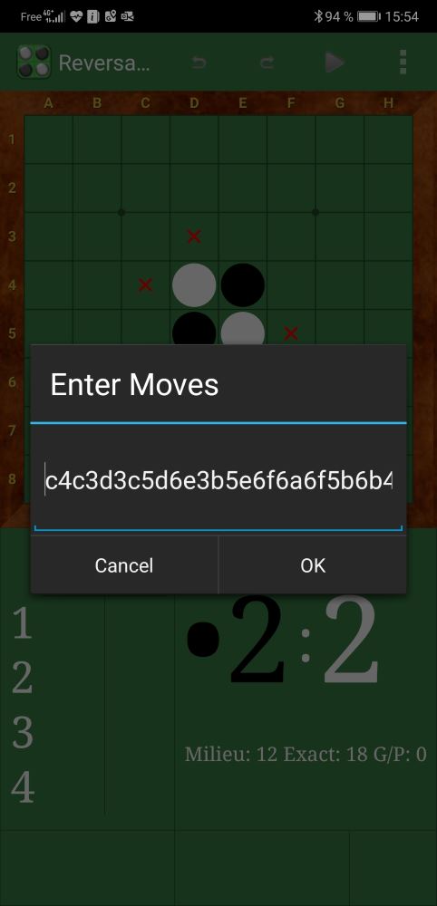 Reversatile reprend donc le même moteur que DroidZebra, ainsi que l’essentiel de l’interface utilisateur. On note toutefois quelques différences dont une amélioration importante : l’apparition d’une fonction baptisée Enter Moves (pourquoi ne pas l’avoir traduit ?), permettant d’entrer une séquence de coups. Typiquement, on copie la séquence à partir d’une autre application (par exemple sur le site Live Othello), puis on revient dans Reversatile et on sélectionne la fonction Enter Moves. Et miracle, pas besoin de coller la séquence, elle a été automatiquement dupliquée à partir du presse-papier. On peut ensuite naviguer dans la partie, par exemple en mode Entraînement.