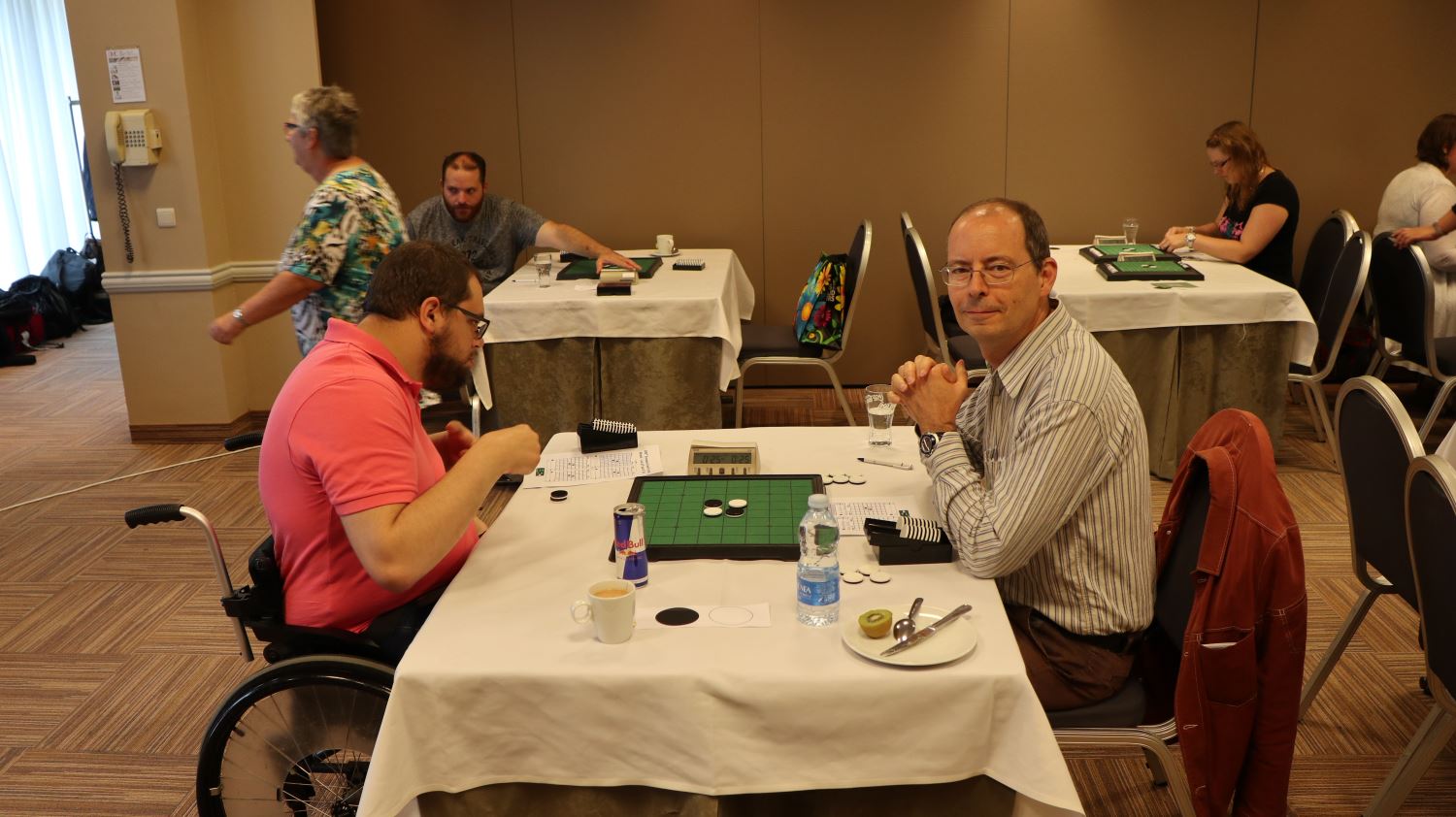 Durant le toutes-rondes, une très étonnante partie a opposé Ahmed Hassan à la très jeune Jana Verstuyft. Ahmed joue en 15.h5, un coup qui semble à la fois bon et innocent. Jana répond par 16.a3, probablement dans une stratégie de maximisation, généralement vouée à l’échec. Sauf qu’ensuite, ni Noir ni Blanc n’a de coup légal et la partie est donc finie. Blanc l’emporte 17 à 3 points (en fait 61 à 3, puisque les cases vides appartiennent au vainqueur).