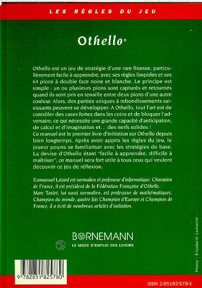 d’Othello 1988 (joué à Paris) s’adressait plutôt à des joueurs réguliers : les principales idées stratégiques et tactiques sont rappelées en sept pages, tout le reste du livre étant consacré aux analyses de parties, par les meilleurs joueurs français. Bon achat si vous avez la chance de le trouver chez un bouquiniste.