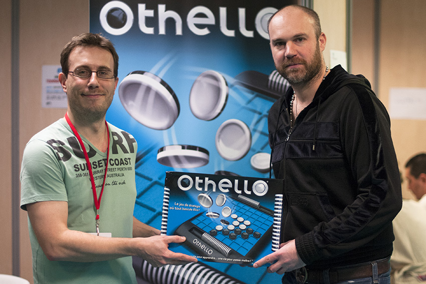 Un mot rapide pour dire que j’avais trouvé Dom particulièrement affuté (pour ne pas dire « velu ») les jours précédents le tournoi (il m’a confessé avoir passé pas mal de temps sur eothello.com, l’excellent serveur de jeu asynchrone créé par Borja Moreno Fernández) mais, comme je suis très attaché aux habitudes, je n’ai pas pu m’empêcher de le tauler 😉