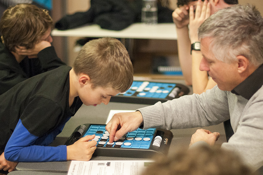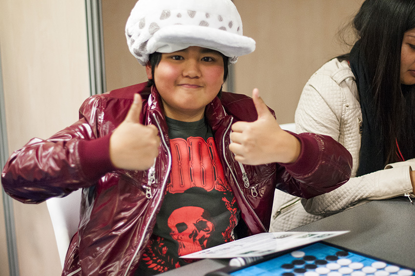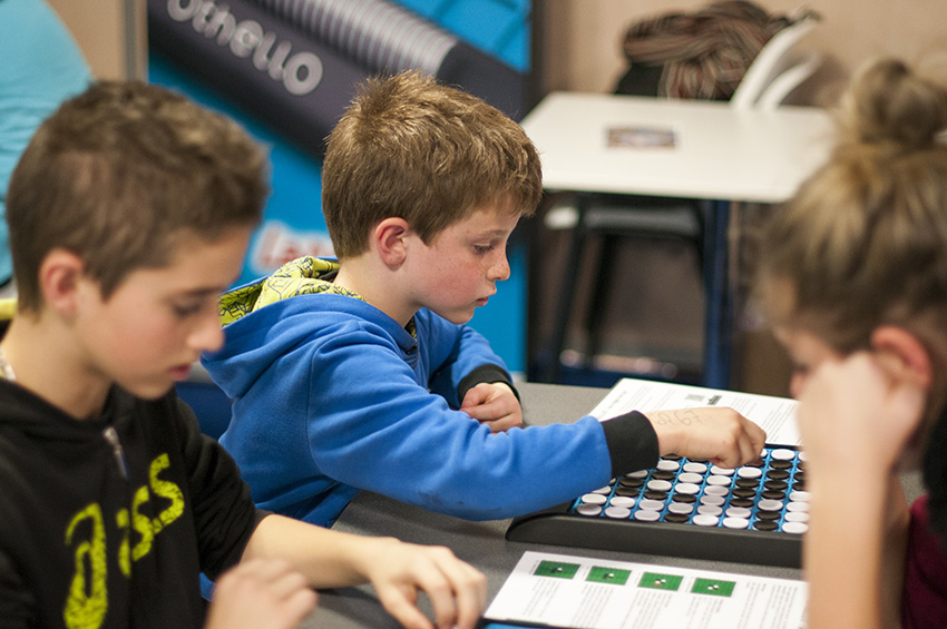 Le Festival International des Jeux de Cannes, c’est une mécanique bien huilée : le vendredi nous accueillons soit des groupes de scolaires, soit des jeunes des centres de loisirs (lorsque le festival tombe pendant les vacances de l’académie de Nice, comme c’était le cas cette année). Notre mission consiste alors à initier chaque groupe (à raison de 30 minutes par groupe) au principe de retournement des pions (notez que les plus jeunes ont généralement entre 5 et 7 ans), aux rudiments de la stratégie (il y a toujours un ou deux malins qui veulent tout de suite connaitre les ficelles), et plus généralement aux vertus du jeu.