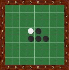 Le premier coup de Noir est, par exemple, en f5 (voir figure 2). En jouant f5, il encadre le pion blanc e5 entre le pion qu’il pose et un pion noir déjà présent (ici d5) ; il retourne alors ce pion (voir figure 3). Noir aurait aussi pu jouer en e6, c4 ou d3. Notons que ces quatre coups de Noir sont parfaitement symétriques ; Noir n’a donc pas à réfléchir pour choisir son premier coup.