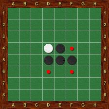 C’est maintenant à Blanc de jouer. Il a trois coups possibles (voir figure 4). En effet, il est obligatoire de retourner au moins un pion adverse à chaque coup. Blanc peut donc jouer en f4, f6 ou en d6.