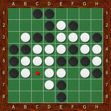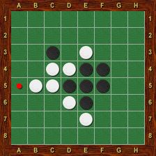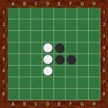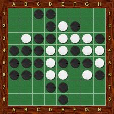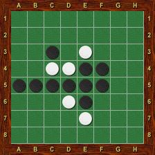 Le joueur Noir a joué en c6. Il retourne alors les pions b6 (encadré grâce à a6), b5 (encadré grâce à a4), d7 (encadré grâce à e8), c5 et c4 (encadrés grâce à c3). Notons que ni d6, ni e6 ne sont retournés à cause de la case vide en f6. Il n’y a pas de réaction en chaîne : les pions retournés ne peuvent pas servir à en retourner d’autres lors du même tour de jeu.