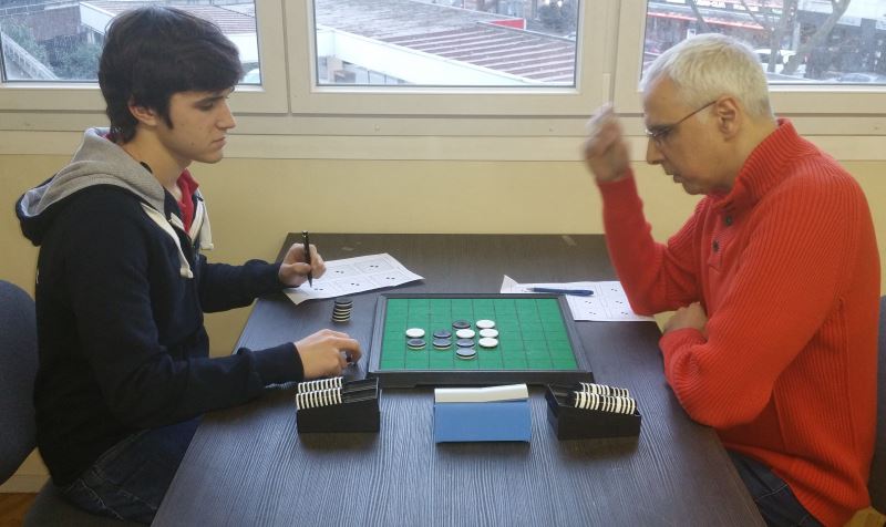 Bravo à Marc Bertrandias qui remporte son premier tournoi (et qui aura appris la ruse du T qui lui aurait permis de gagner plus largement sa dernière partie, ci-dessus, en jouant a2 au coup 55). Toutes les parties sont sur http://www.liveothello.com (accès direct au tournoi) (merci Manu).