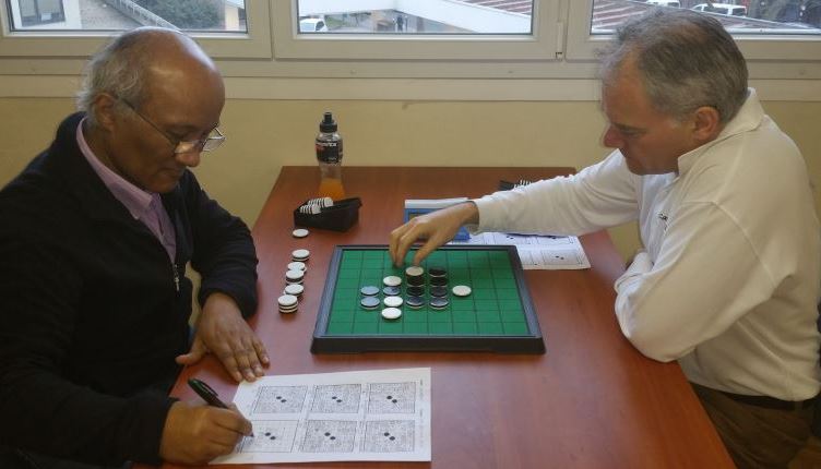Finalement, comme nous étions 7, nous avons décidé de faire un toutes-rondes (7 rondes) avec 20 minutes par joueur par partie. Le tournoi a été très disputé jusqu’au bout. Après 5 rondes, Manu Lazard et Thierry Lévy-Abégnoli étaient seuls en tête et on pensait qu’ils allaient jouer la finale du tournoi. Thierry a gagné mais a perdu ensuite 31 à 33 contre Marc Bertrandias (qui avait largement battu l’autre Marc préalablement) pendant que Manu battait Bintsa Andriani 32-31… Finalement, c’est presque comme à l’école des fans de Jacques Martin, il y a quatre premiers ex aequo, ce qui signifie que plus de la moitié des participants au tournoi terminent premiers !