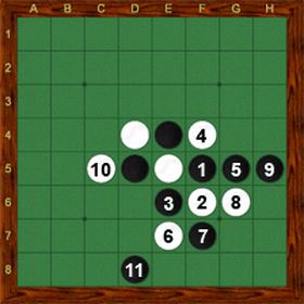 1.f5, 2.d6, 3.c5, 4.f4, 5.e3, 7.d3, 8.f6, 9.e6, 10.d7, 11.g4,