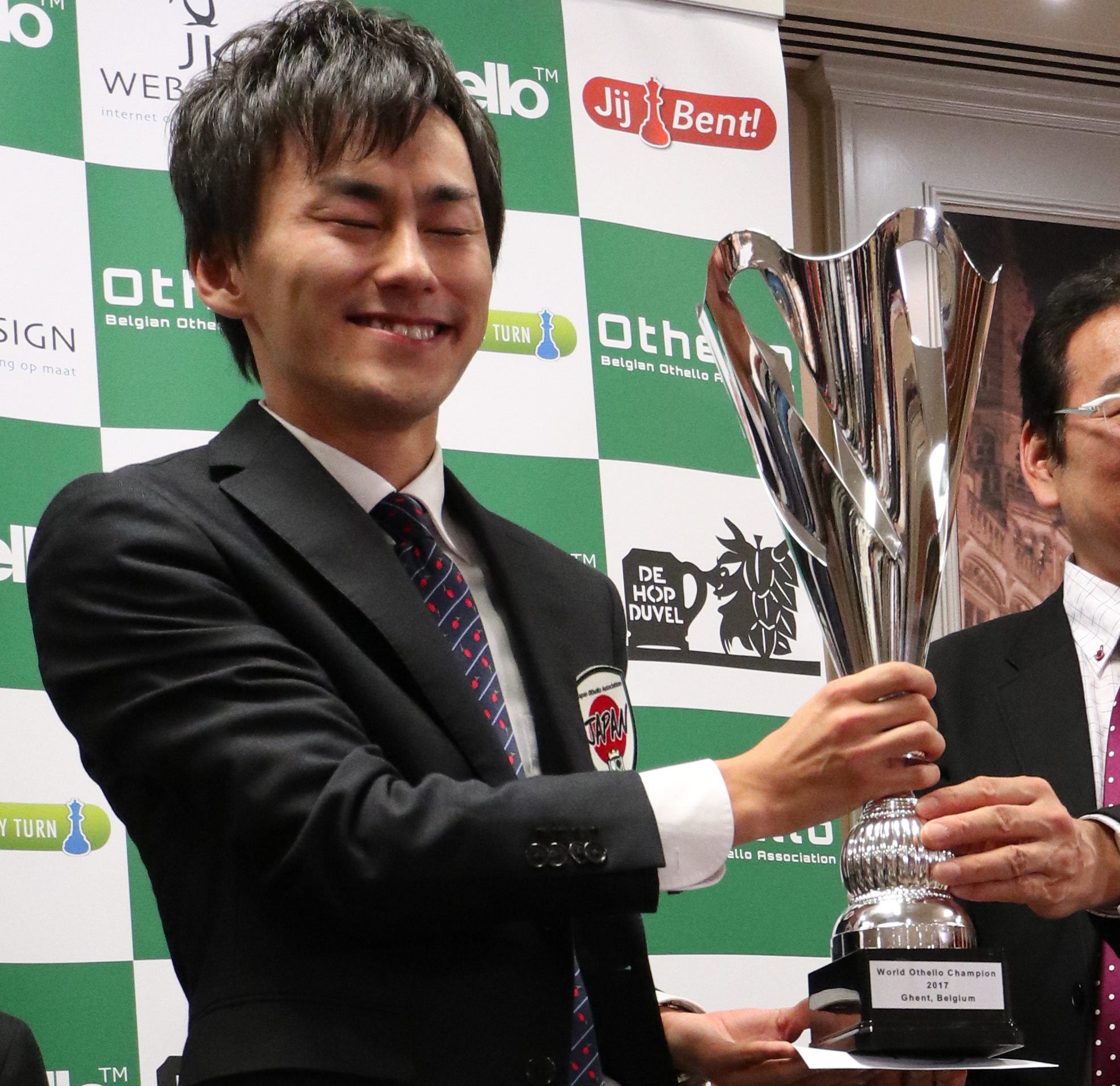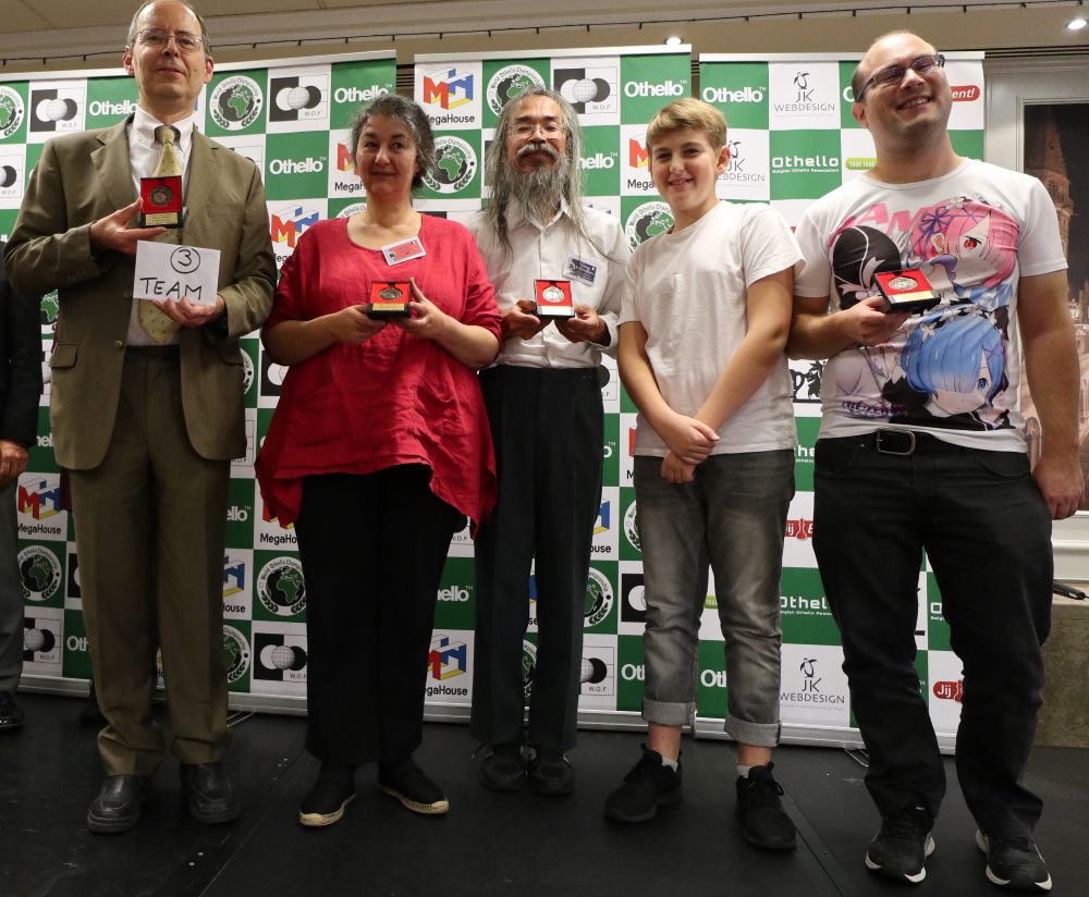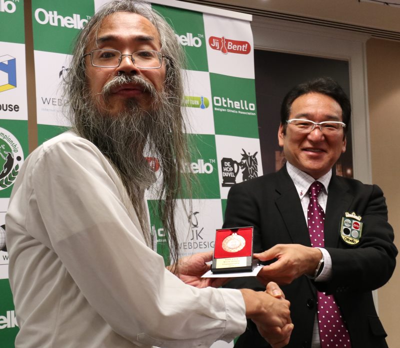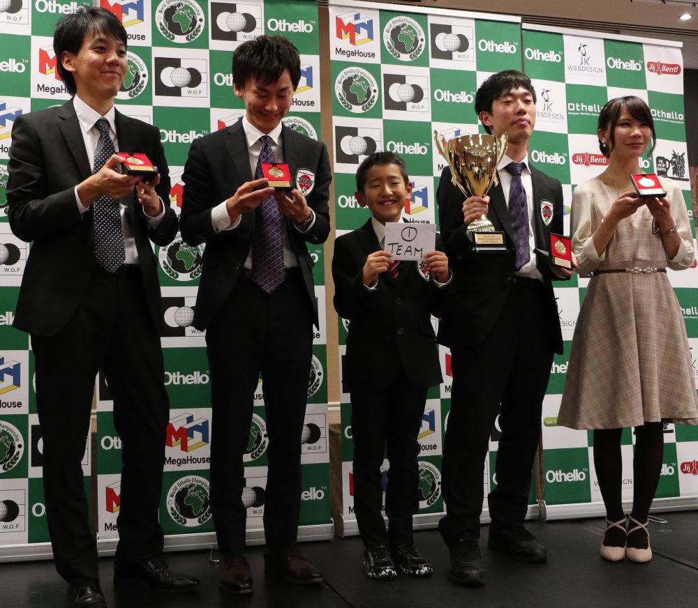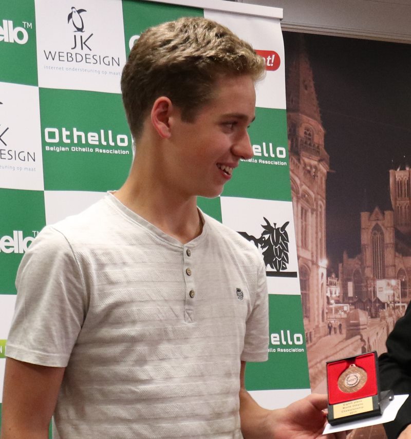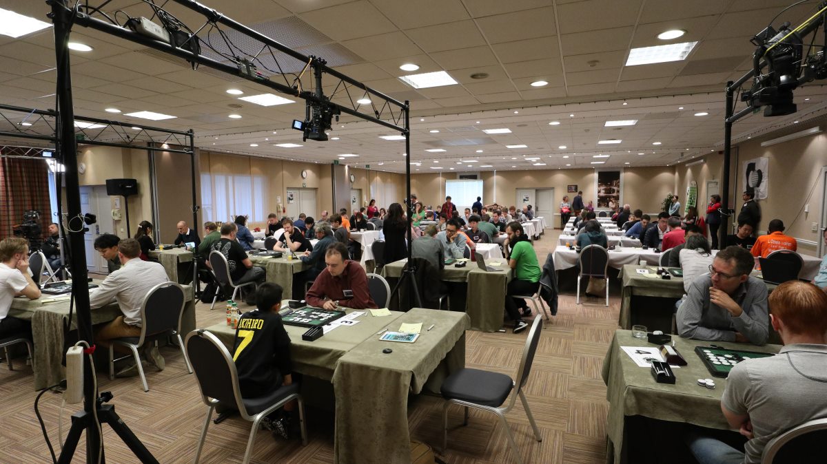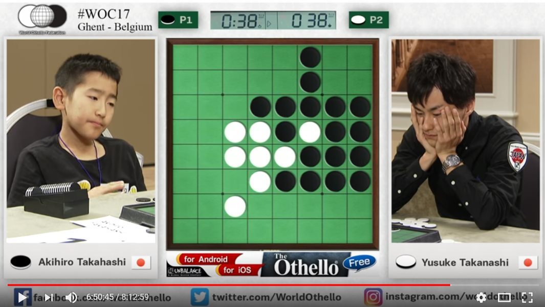 Organisée à Gand en Belgique, début novembre, l’édition 2017 du championnat du monde d’Othello a réuni 86 joueurs appartenant à 27 nations. Un record ! Comme d’habitude, les Japonais étaient favoris aussi bien par équipes qu’individuellement, avec en tête des pronostics le quadruple champion du monde Yusuke Takanashi. Si ce dernier s’est bien qualifié pour la finale avec 10,5 points durant les 13 rondes, la surprise est venue du junior Akihiro Takahashi, à peine 12 ans, qui ne faisait même pas partie des 3 joueurs dont les scores sont comptabilisés pour le classement par équipes. Le préadolescent, qui plus est fort petit pour son âge, a terminé en tête du système suisse avec 12 points (comme son âge !), ne perdant que contre Yusuke Takanashi.